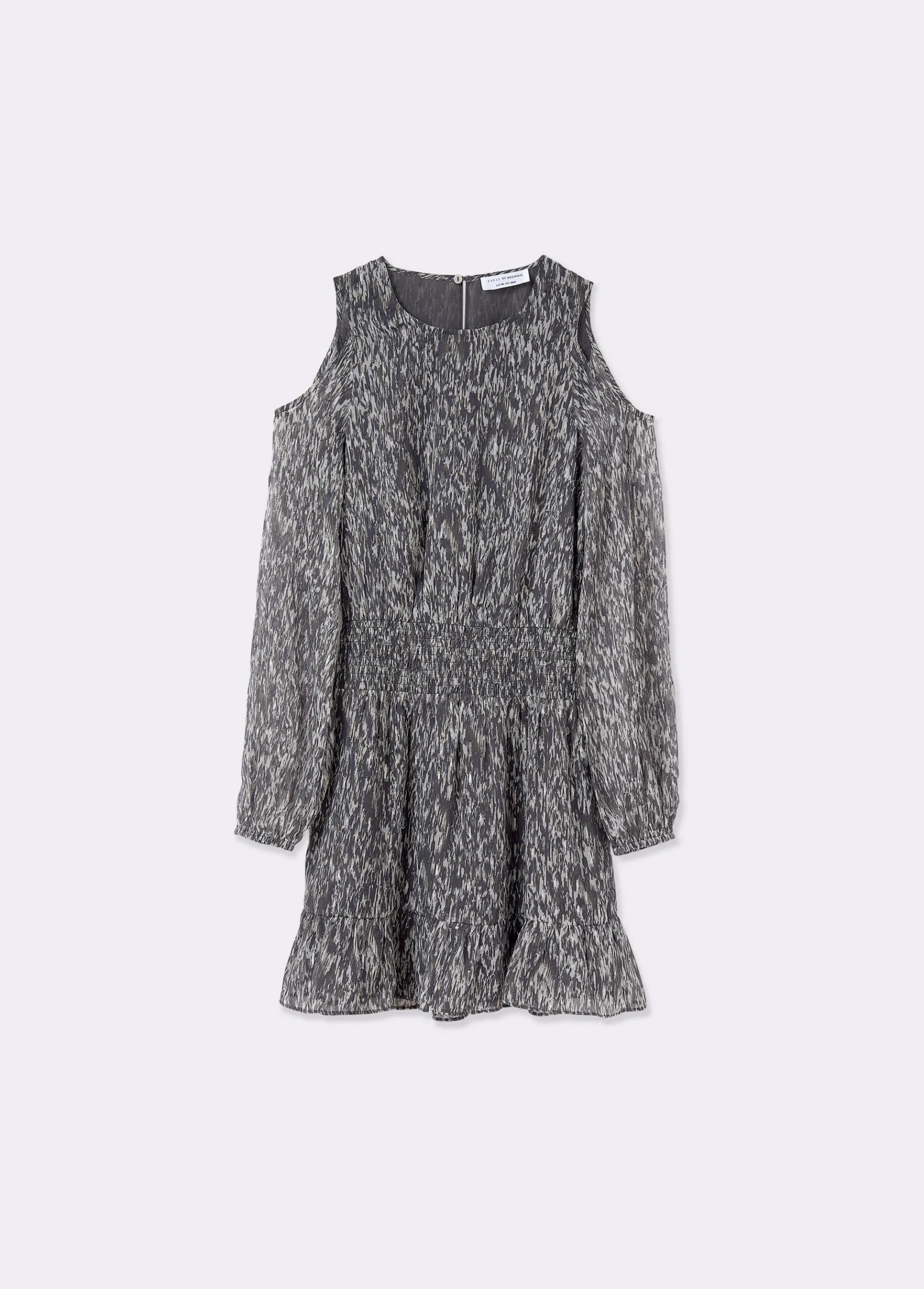 Vestido corto estampado de manga larga abullonada, hombros descubiertos, smock en la cintura y volantes.