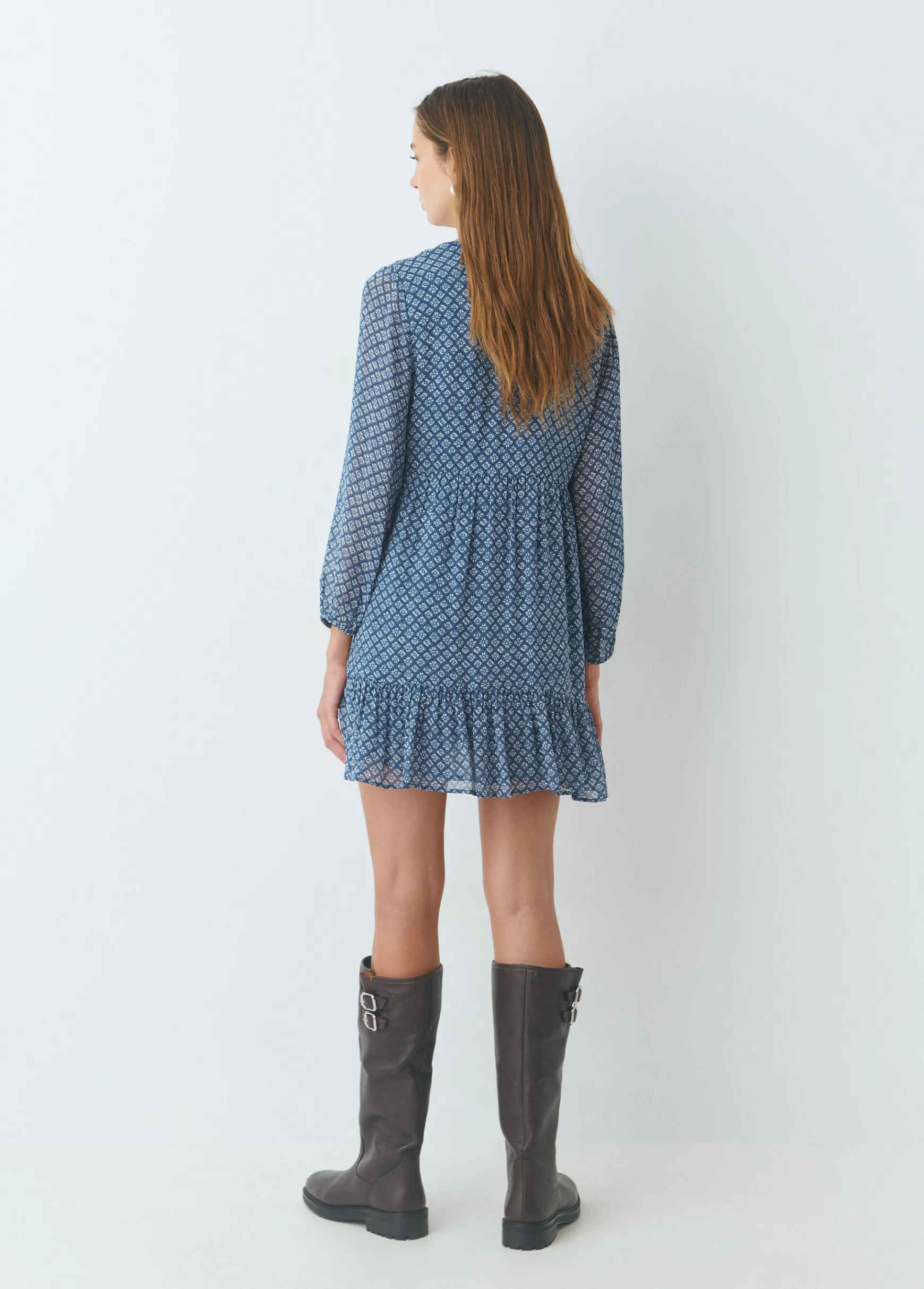 Vestido corto estampado, manga larga abullonada, cuello de pico con lazada y volantes.