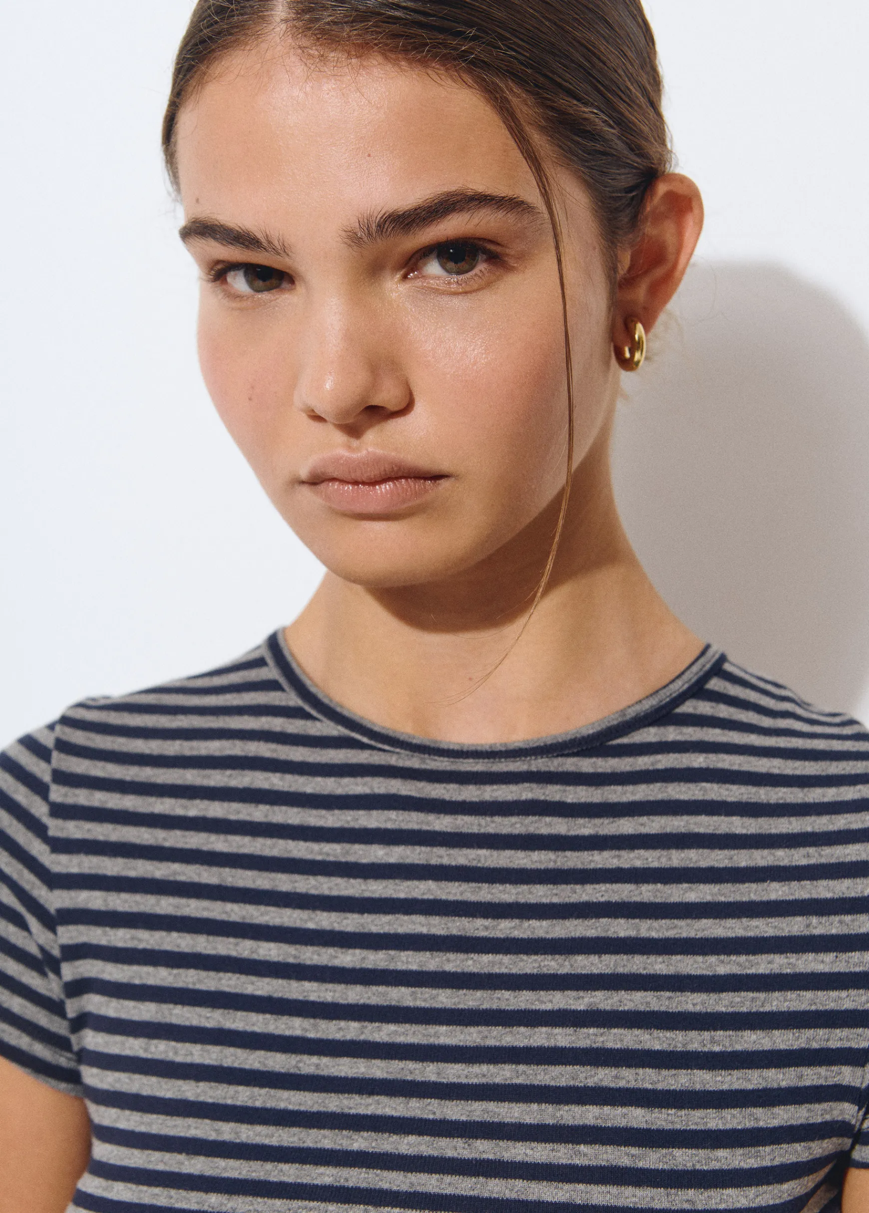 Vestido midi de rayas de manga corta, cuello redondo y detalle de apertura.