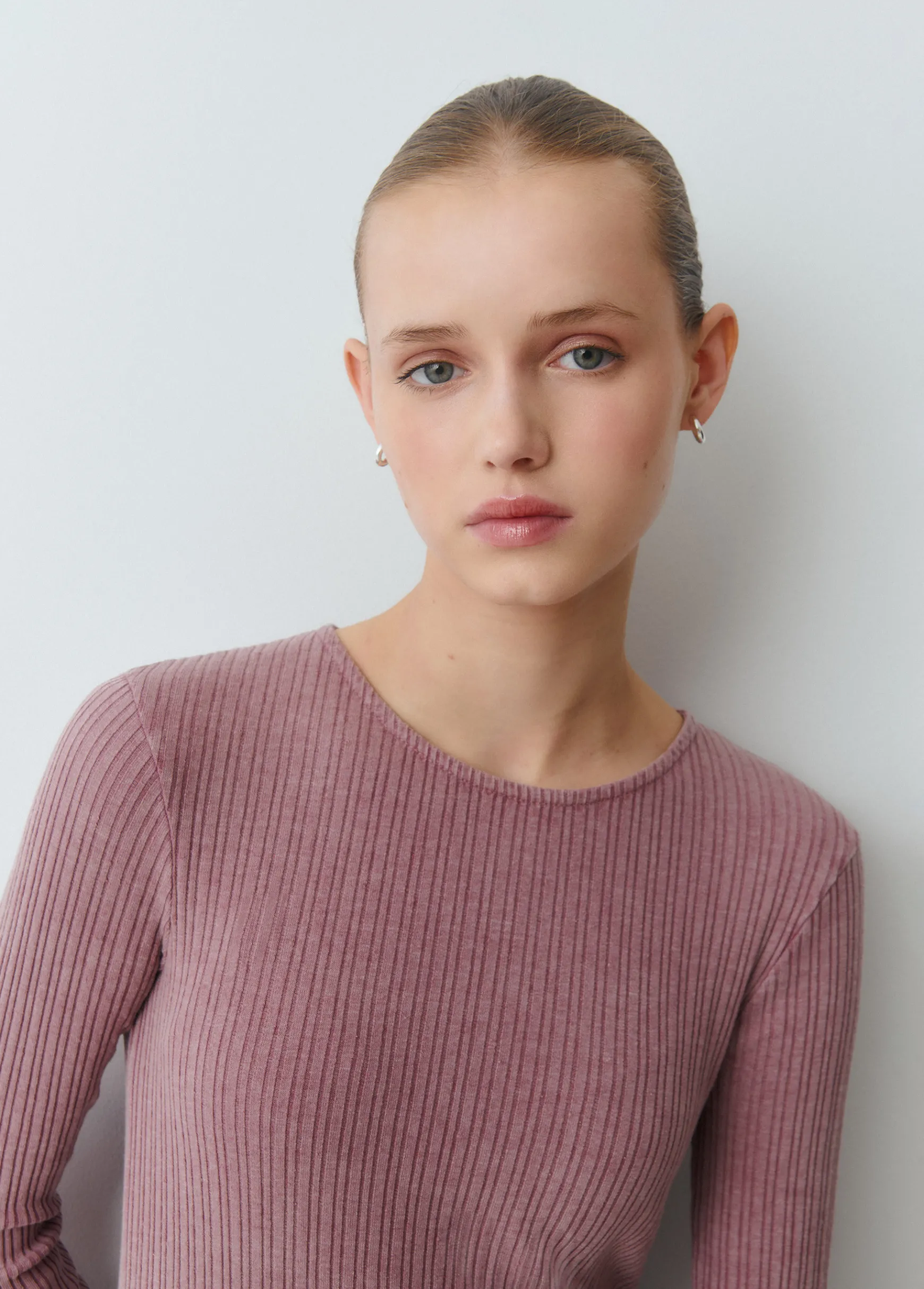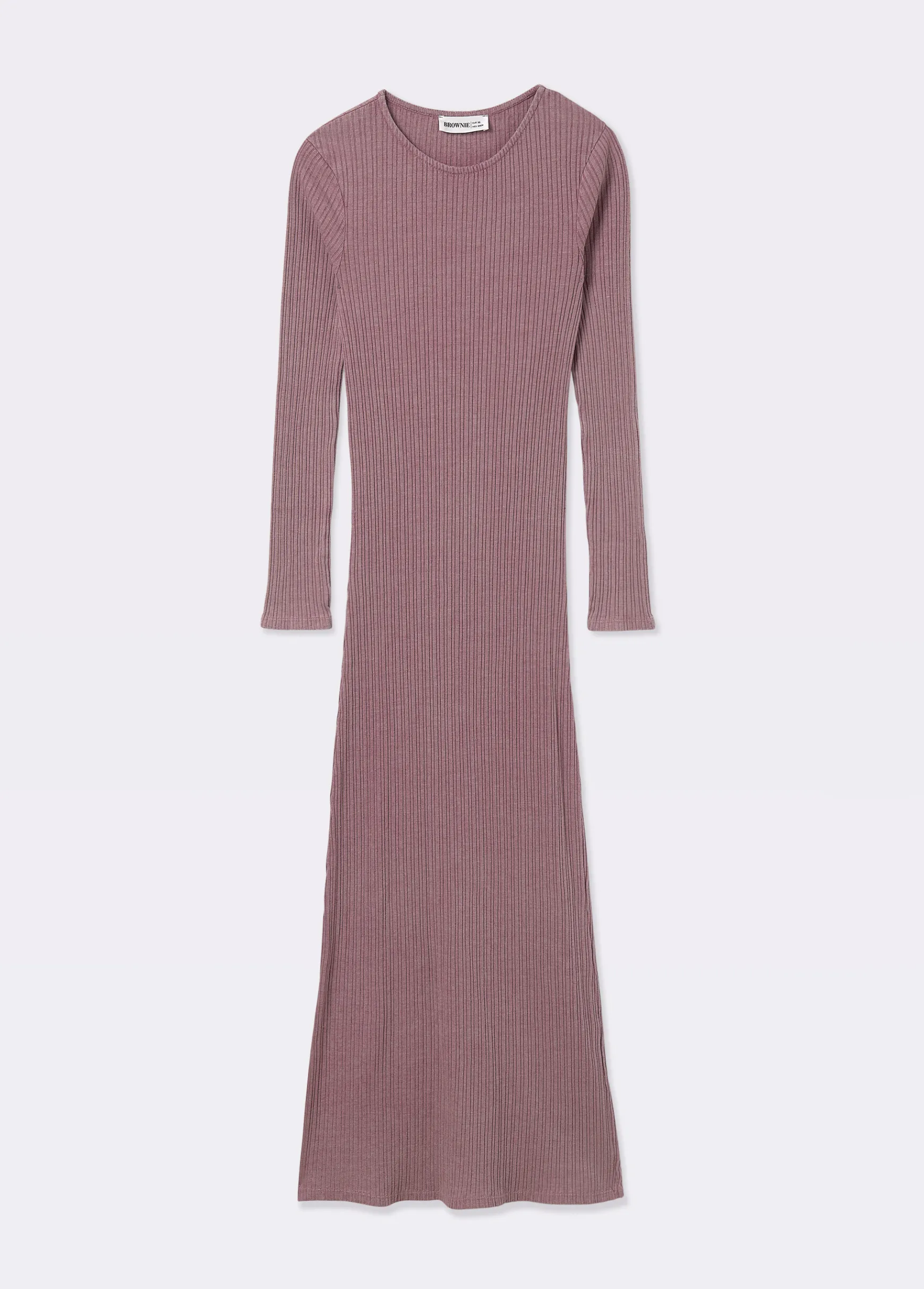 Vestido midi de canalé de manga larga, cuello redondo y detalle de apertura.
